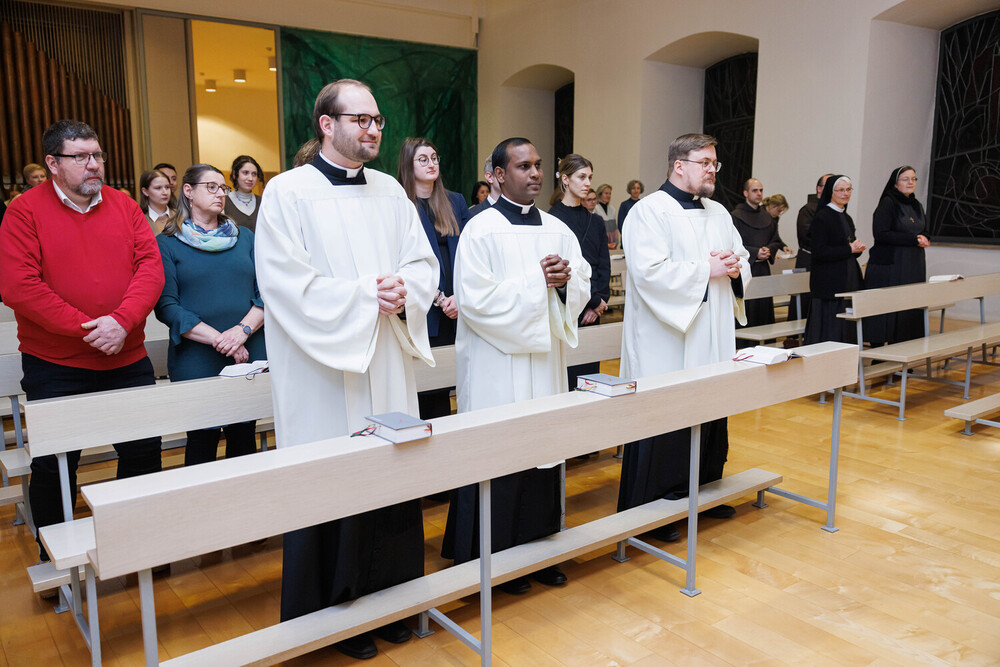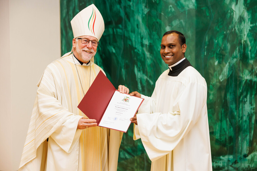 Ajayan Joseph, für die Diözese Punalur (Indien), und Lukas Krobath aus der Pfarre St-Theresia, empfingen die Beauftragung zum Akolythen. Neben der Assistenz in der Messe sind Akolythen zum Dienst des Aussetzens des Allerheiligsten für die eucharistische Anbetung und das Bringen der Kommunion zu den Kranken und Alten bestellt. Bischof Marketz betonte, dass es wichtig ist diesen Dienst mit der Gemeinde zu verrichten und dass wir durch unsere Tätigkeit weitere Gläubige dazu ermutigen und befähigen sollten, sich in den Akolythendienst stellen zu lassen. Denn die Eucharistie ist, wie es das 2. Vatikanische Konzil formuliert: „Quelle und Höhepunkt des christlichen Lebens“ (Lumen Gentium 11).