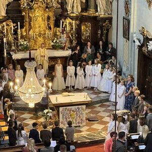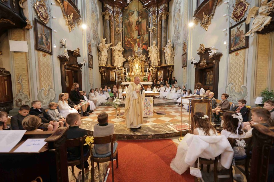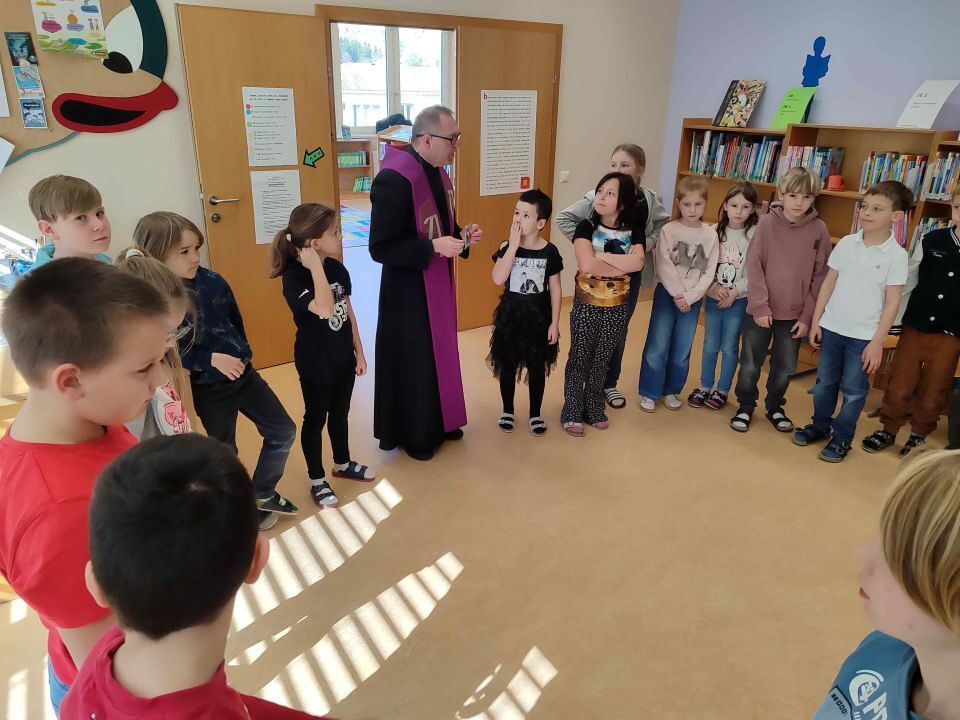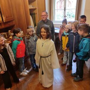 Im Rahmen der Vorbereitung wurde neben den drei gemeinsam gestalteten Familiengottesdiensten zudem eine Kirchenführung mit vier Stationen angeboten, bei der die Kinder ihre Pfarrkirche ganz neu entdecken durften. Der Altarraum, die Sakristei, der Klostergarten und die Spiele im Pfarrsaal wurden erkundet – verbunden mit vielen spannenden Informationen über Symbole und liturgische Gegenstände.
