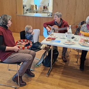 Bei einem Gläschen Wein, Kaffee und hausgemachten Mehl­spei­sen wur­den dann auch einige alt­bekan­nte Lie­der ge­sun­gen. Regina Dietrich be­glei­te­te die Sänger:­innen auf der Gitarre und die mit­ge­brach­ten Texte ver­lei­te­ten die Gäste zum Mit­singen.